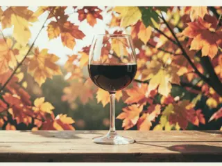 Conceito visual principal: garrafas, taças, vinho tinto, vinho branco, outono, mesa, elegância, luz natural, sofisticação, harmonia.